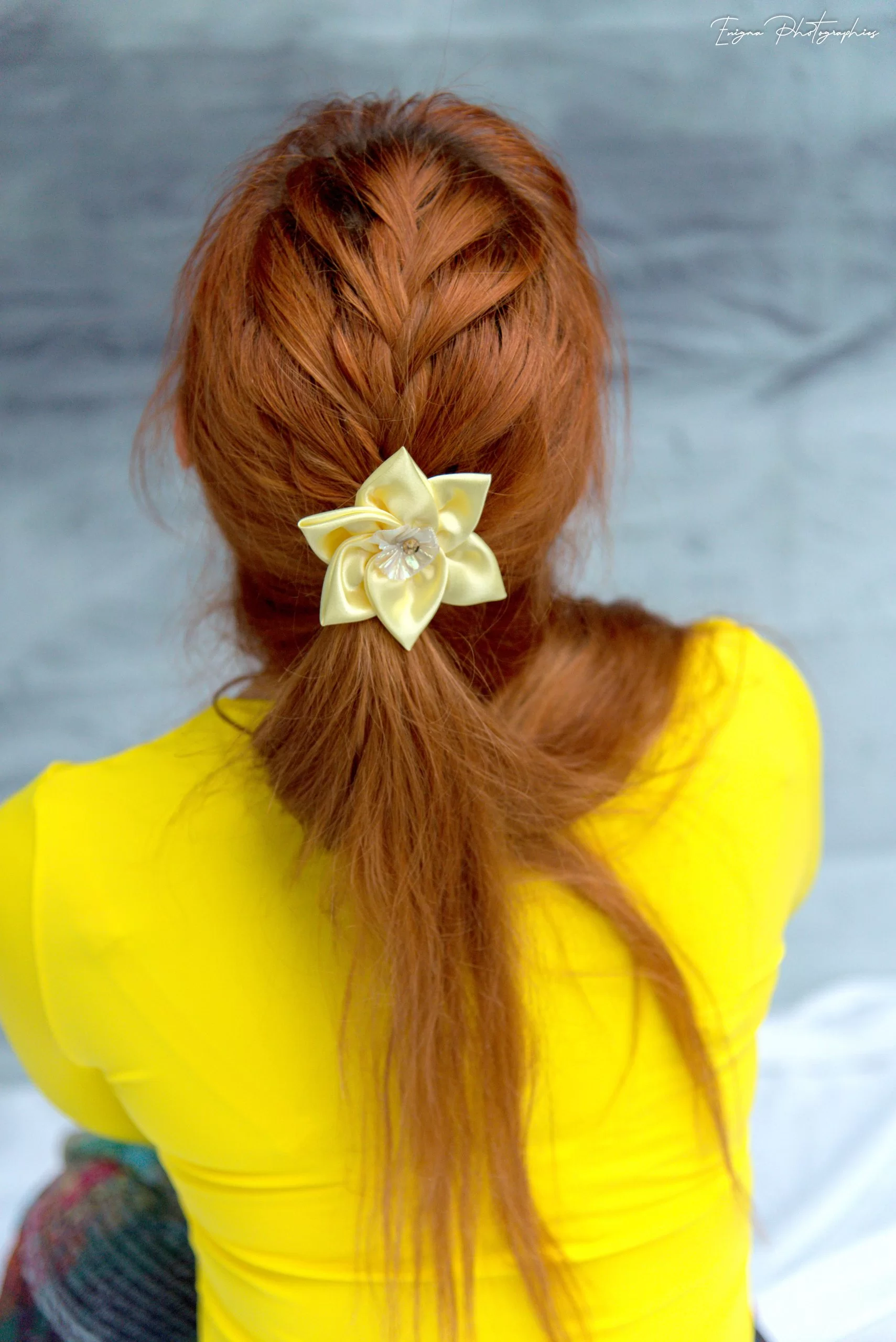 Accessoire pour cheveux Made in France en forme de fleur faite main en satin jaune et organza irisé