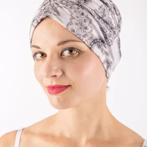 Turban femme made in France en lycra blanc imprimé Arabesques